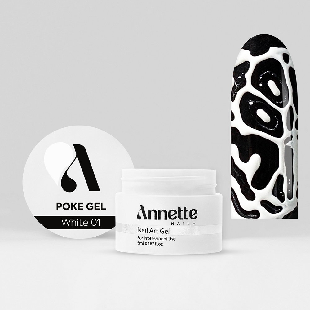 Poke Gel Annette Nails este un gel nail art texturat, cu efect spectaculos, care permite crearea cu ușurință a modelelor de tip graffiti, texturi de reptilă, detalii abstracte, bule, litere și alte efecte 3D, datorită efectului special de întindere. Gelul are o consistență medie-vâscoasă, menținând perfect forma acolo unde este creată. Se pot obține cu ușurință efecte 3D de impact, fără a fi nevoie de abilități artistice sau talent la pictură. Este potrivit atât pentru începători, cât și pentru profesioniști.