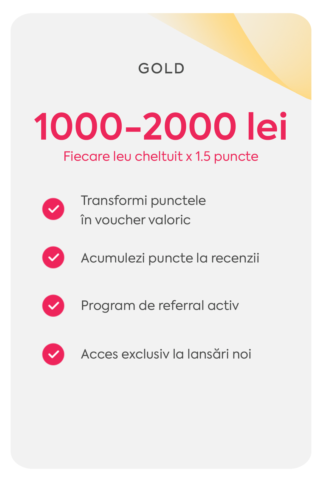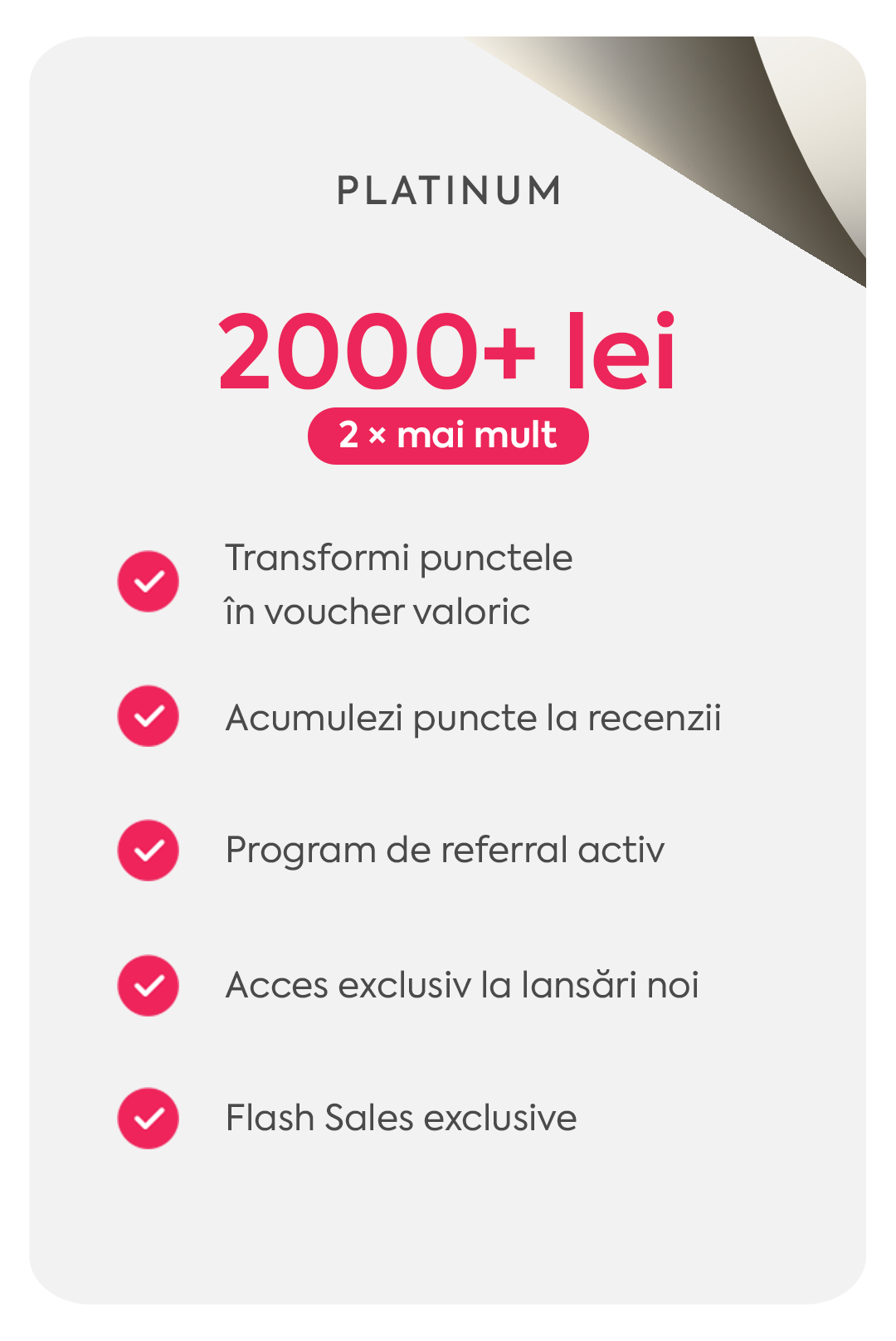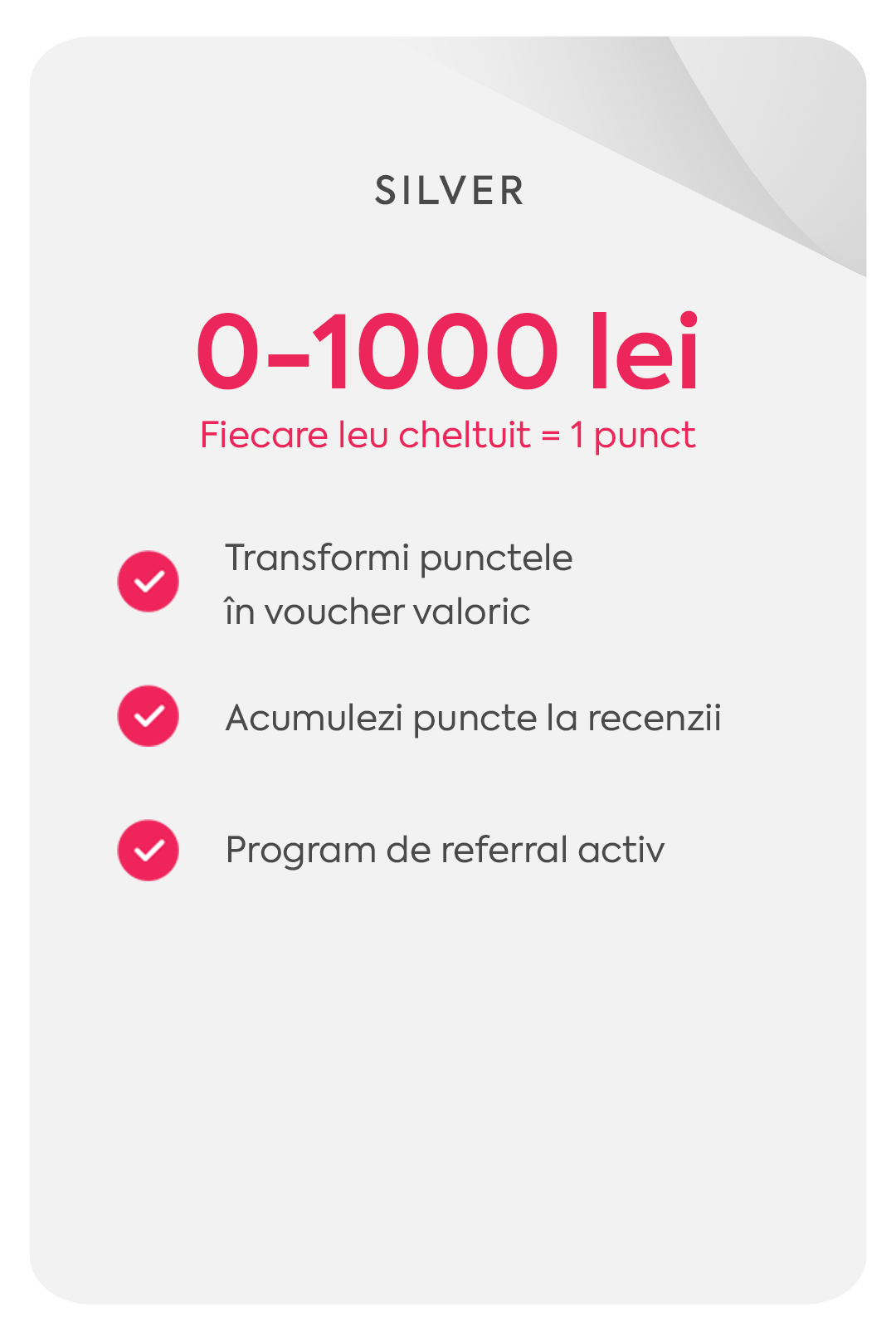 Găsești toate informațiile în contul tău, în secțiunea „Loyalty”. Acolo poți vedea: ✔ soldul de puncte, ✔ nivelul tău curent (Silver/Gold/Platinum), ✔ istoricul punctelor (cum au fost câștigate și folosite). Punctele dintr-o comandă se actualizează după ce comanda este livrată și finalizată (achitată și neanulată).