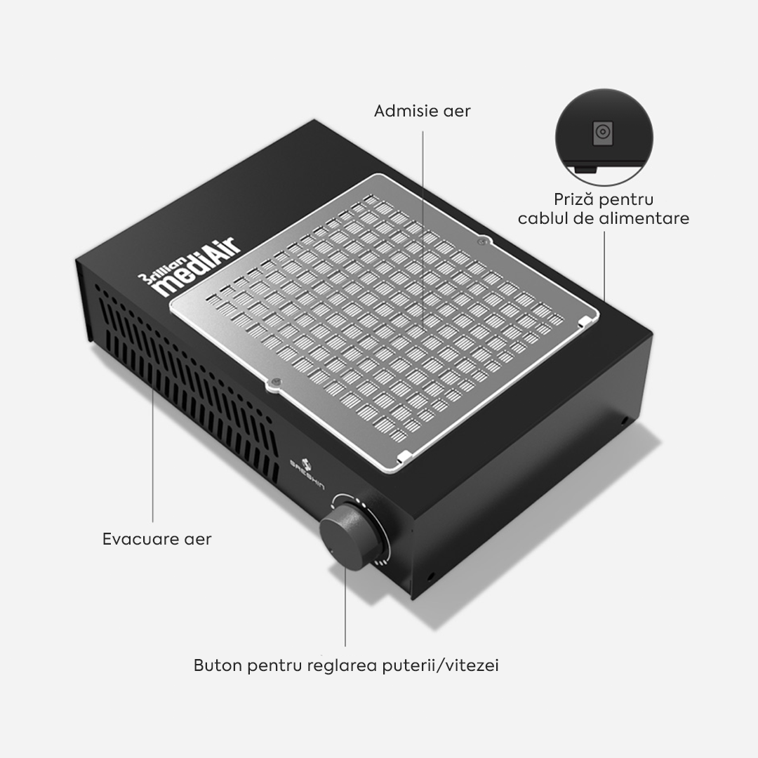 Motorul său de înaltă performanță, cu putere de 60W și viteză de până la 4.600 RPM asigură o absorbție rapidă și eficientă a particulelor fine de praf, pulberi de gel și acril, inclusiv cele invizibile cu ochiul liber, fără a compromite confortul clientului. Deși are o putere mare de aspirare, mediAir emite un nivel redus de zgomot, ceea ce oferă o experiență plăcută și relaxantă atât pentru client cât și pentru tehnician.