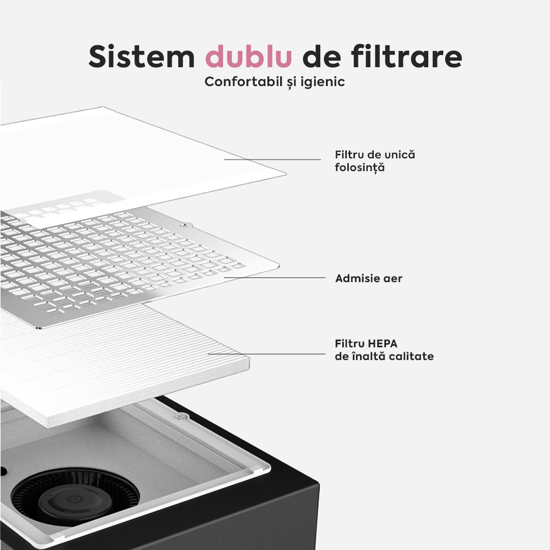 Sistem dublu de filtrare, care captează eficient particulele fine și ultrafine de praf și menține un aer curat în salon - filtru de unică folosință și filtru HEPA de înaltă performanță;