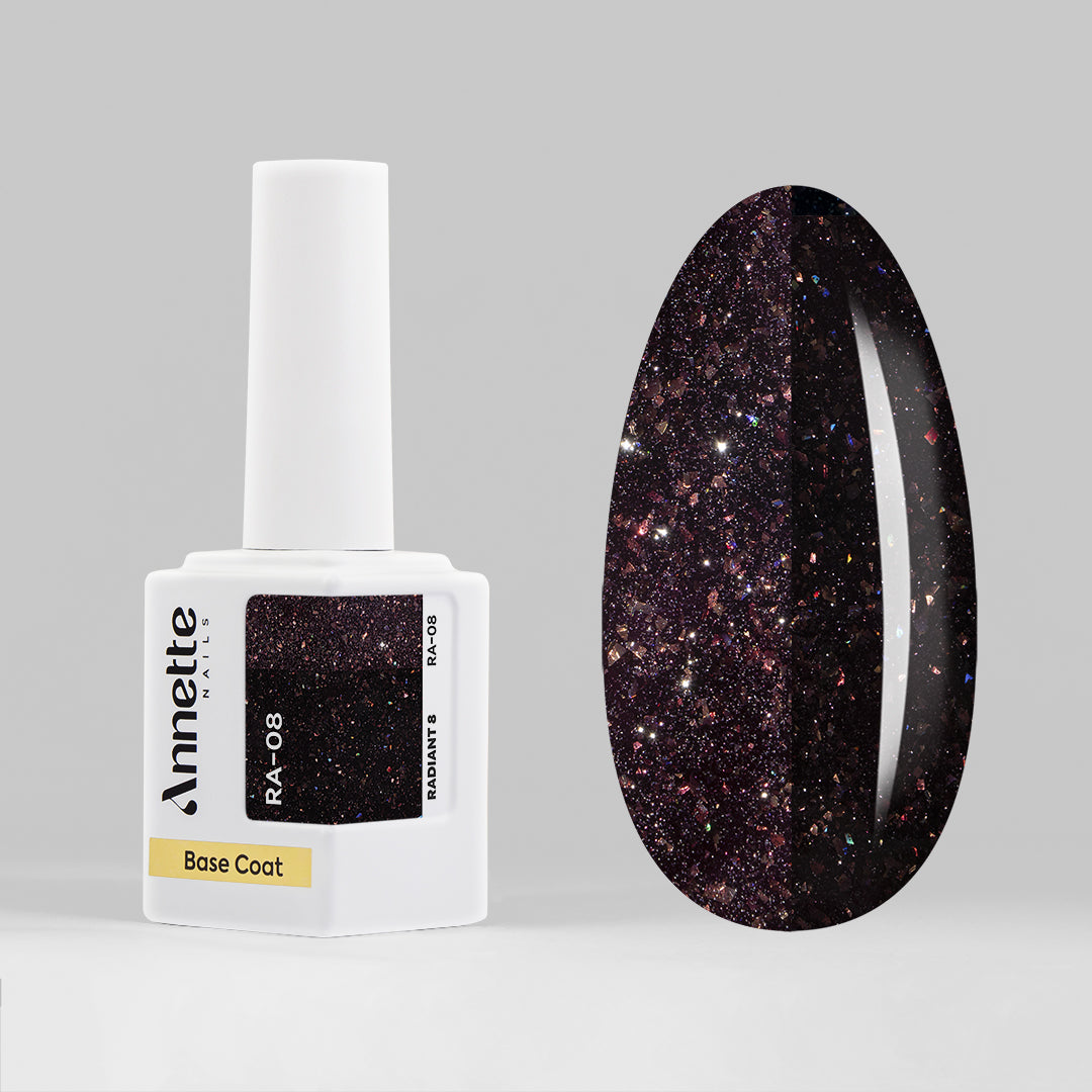 Colecția de Baze Rubber Radiant Annette Nails este compusă din 8 baze autonivelante color, ușor translucide, cu un conținut ridicat de sclipici și folie reflectorizantă. Fiecare bază oferă o strălucire de efect, reflectând lumina din diverse unghiuri. Nuanțele bazelor variază între tonuri vibrante și curajoase precum auriu, verde, burgundy, mov închis și nuanțe mai temperate precum albastru deschis, bordo, gri sau maro sidefat. Inserțiile de particule reflectorizante sunt de culoarea bazei și creează împreună o strălucire cromatică unitară.
