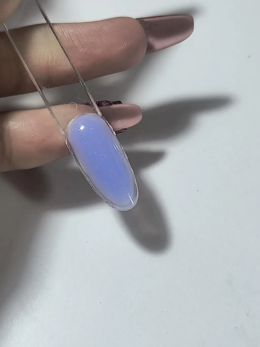 - Se aplică un strat subțire de alunecare din colecția Shimmer Base și fără a polimeriza, aplicăm o bulă de material pe mijlocul unghiei și formăm apexul. Se polimerizează 60 sec în lampă Led sau 2 min în lampă UV. Se recomandă scoaterea mâinii din lampa UV dacă în timpul procesului de polimerizare se degajă căldură.