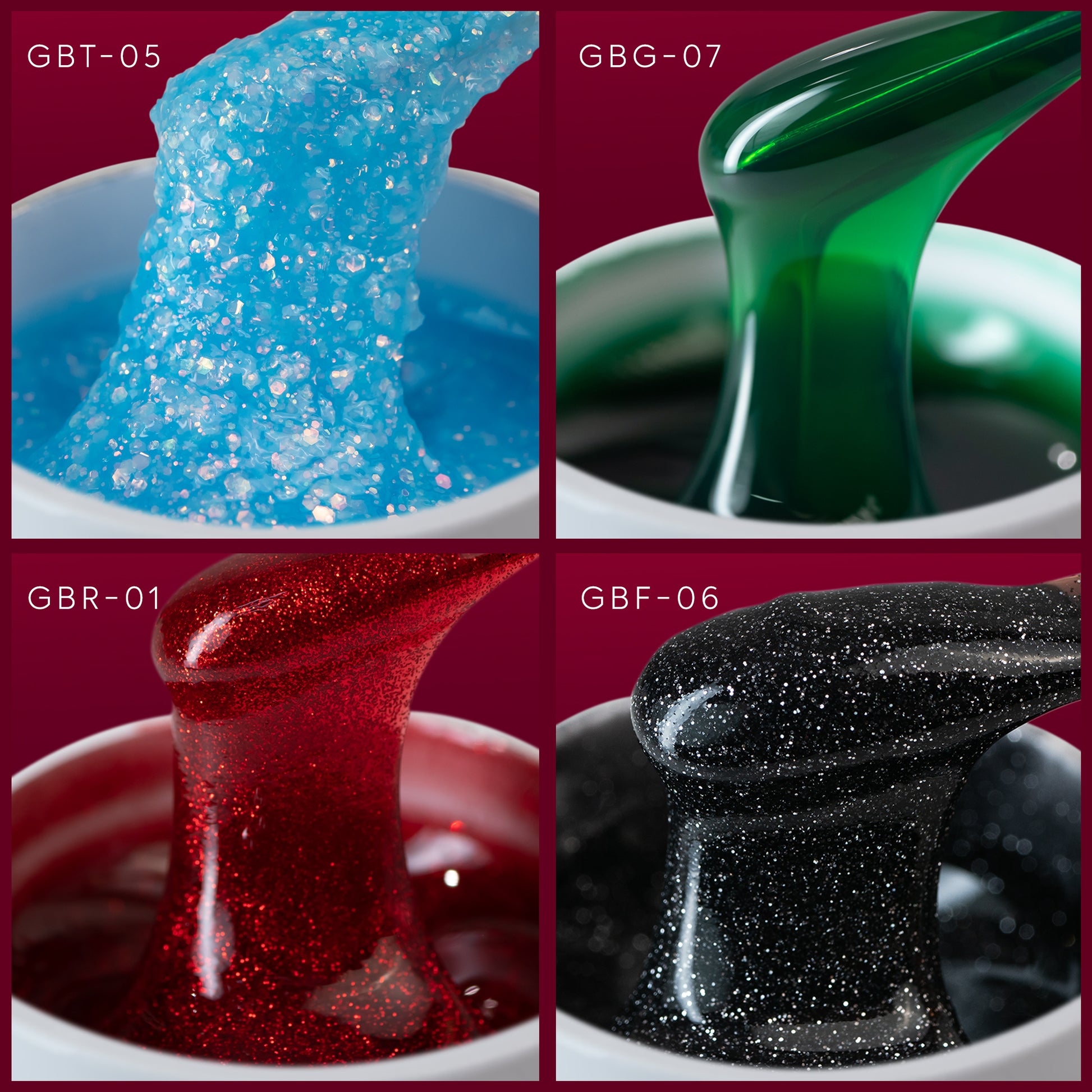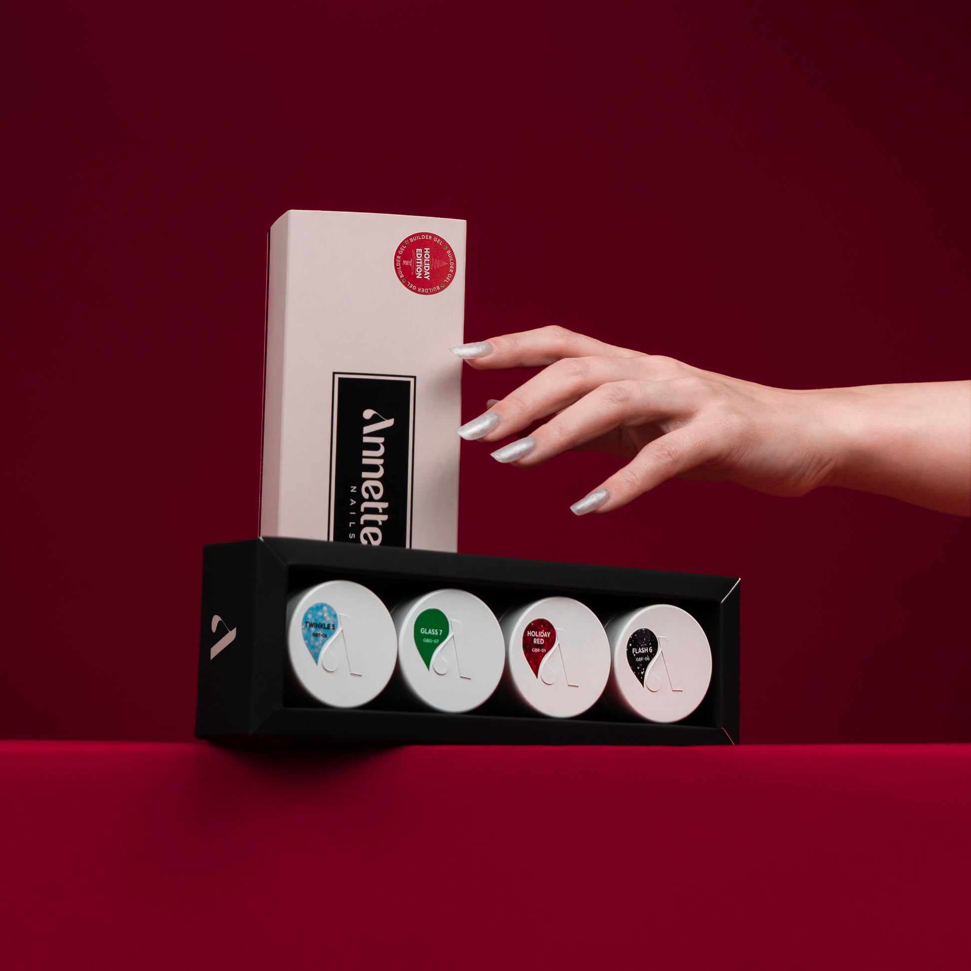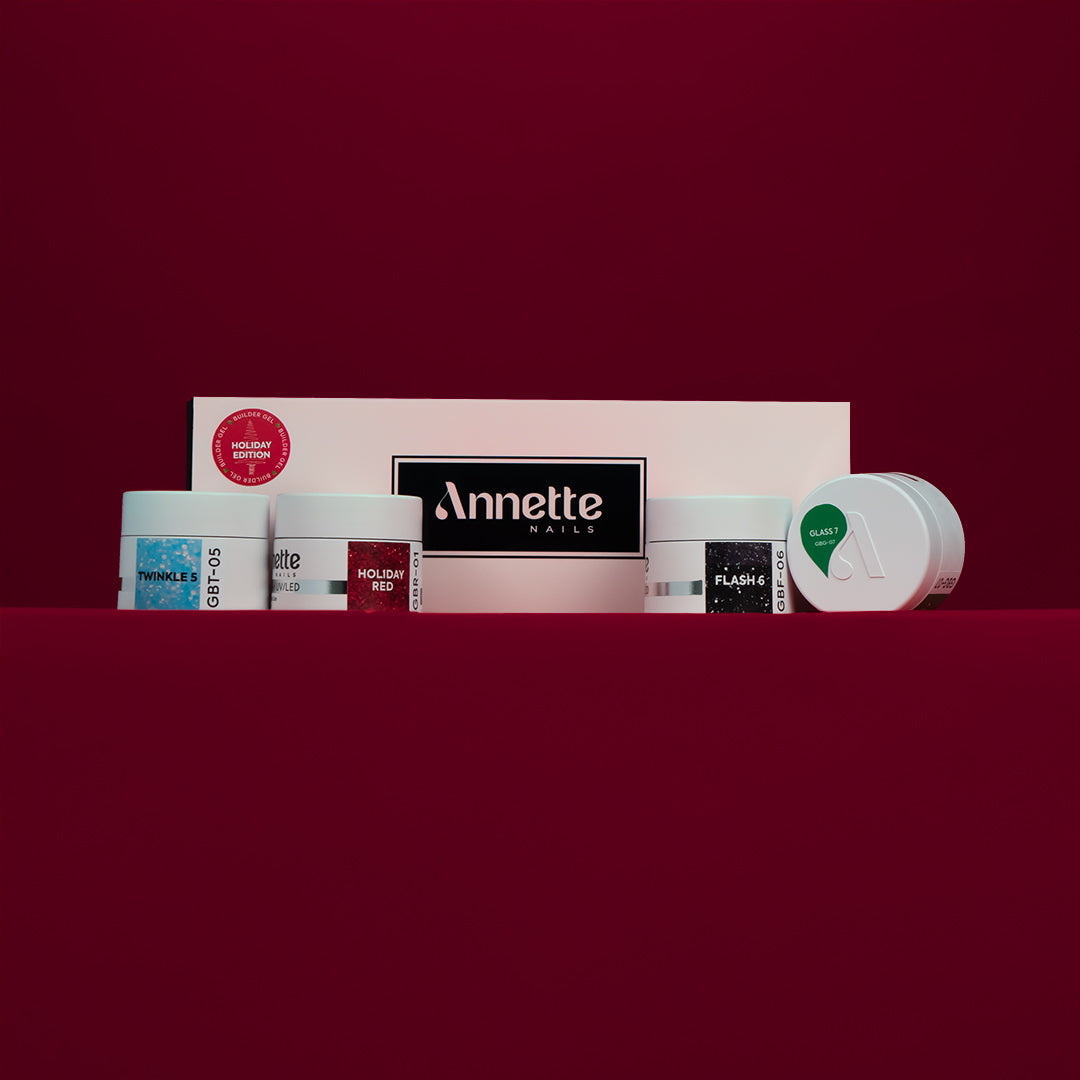 Holiday Edition este o colecție de geluri de construcție Annette Nails creată special pentru manichiuri festive, dedicate sezonului sărbătorilor de iarnă. Setul reunește nuanțe consacrate și efecte vizuale spectaculoase; de la roșu intens cu sclipiri delicate, la verde vitraliu, negru cu sclipici reflectorizant și albastru deschis cu paiete - ideale pentru designuri de Crăciun și Revelion.