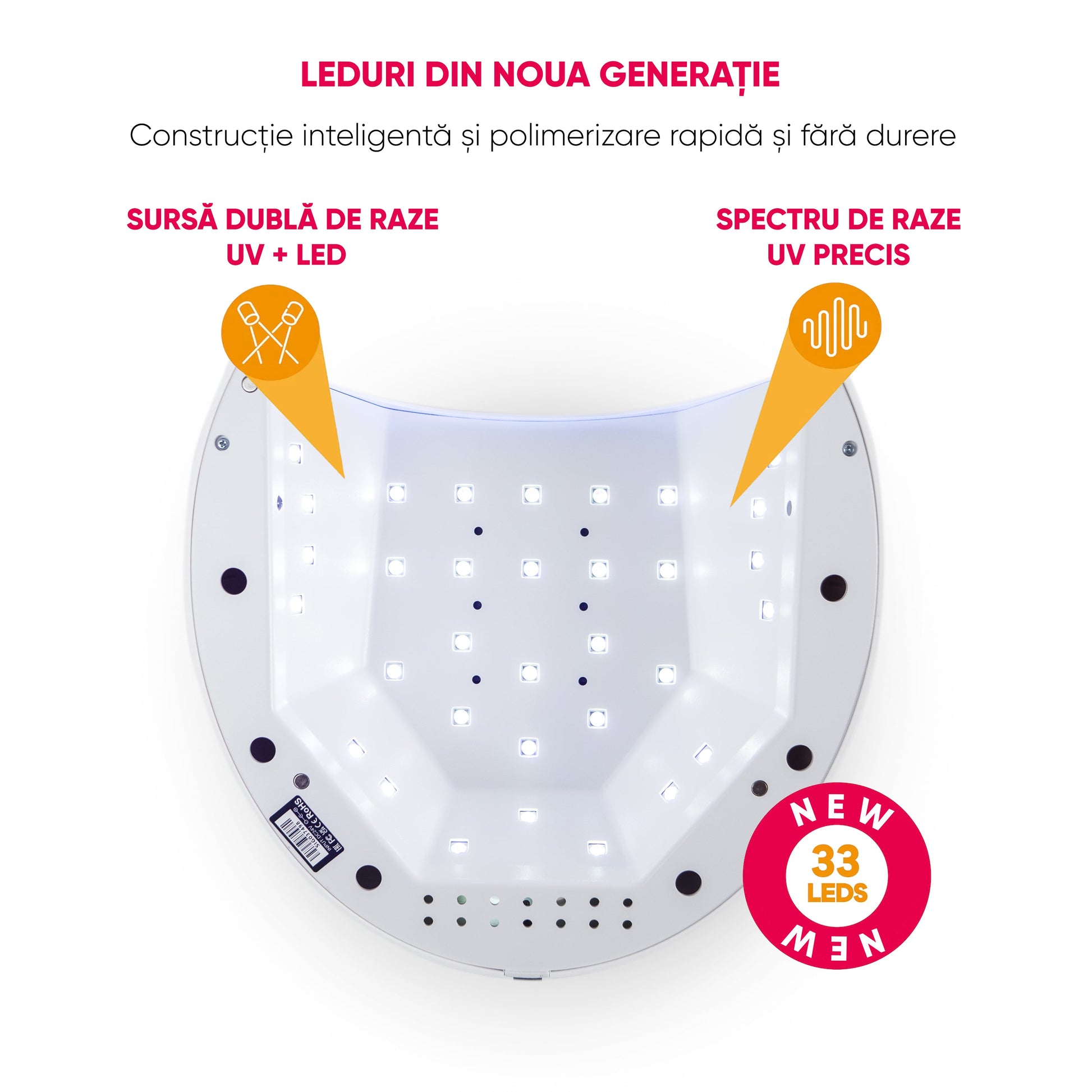 Lampă LED de nouă generație care polimerizează toate tipurile de geluri UV și oje (lacuri) semipermanente. Acest lucru se datorează celor 33 de LED-uri cu lumină duală, perfect distribuite, capabile să emită atât radiație UV identică cu a tuburilor fluorescente (365nm) cât și radiație specifică gelurilor LED (405nm). Putere 48W. Lumina emisă de această lampă nu este violetă, ca a lămpilor clasice, ci este o lumină albă, asemănătoare luminii soarelui, mult mai confortabilă pentru ochi și piele. Carcasă ergonomică de culoare albă cu finisare lucioasă (lăcuită). Lampa este echipată cu timer digital cu 3 poziții, de 10, 30 și 60 de secunde, intervale în care lampa funcționează la putere maximă Full Power. Pentru confortul clientei lampa este prevăzută și cu un mod special de funcționare, denumit "Low Heat". În acest mod intensitatea luminii UV crește lent, treptat, începând de la jumătate din putere până la puterea maximă, în decurs de 90 de secunde. Astfel este evitată complet senzația de arsură atunci când se polimerizează straturi groase de gel constructor, sau straturi de gel aplicate direct pe unghia naturală. Un alt element de confort îl reprezintă bariera cu lumină infraroșie (LED IR + senzor) care detectează introducerea mâinii și care aprinde automat lampa. Lampa se stinge de-asemenea automat la scoaterea mâinii.