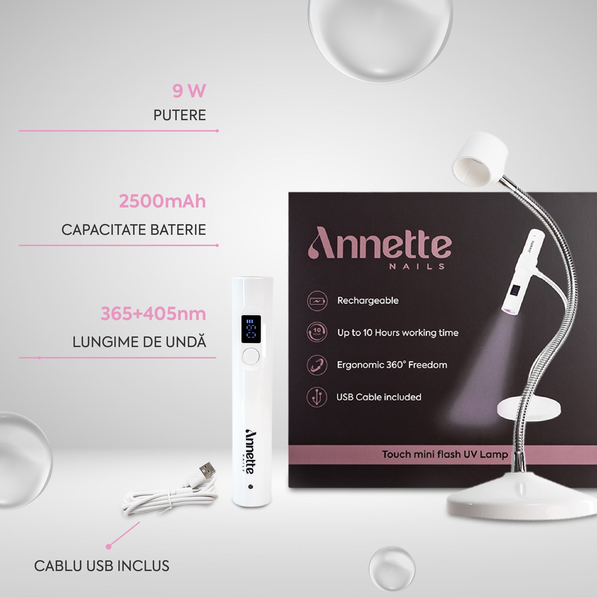 Lampa UV Mini Annette Nails cu Suport Detașabil este un instrument versatil și indispensabil pentru orice tehnician de manichiură. Potrivită pentru toate tipurile de polimeri, precum acrygel, polygel, gel, bază rubber, top coat, lampa este concepută pentru a oferi o polimerizare rapidă și uniformă.