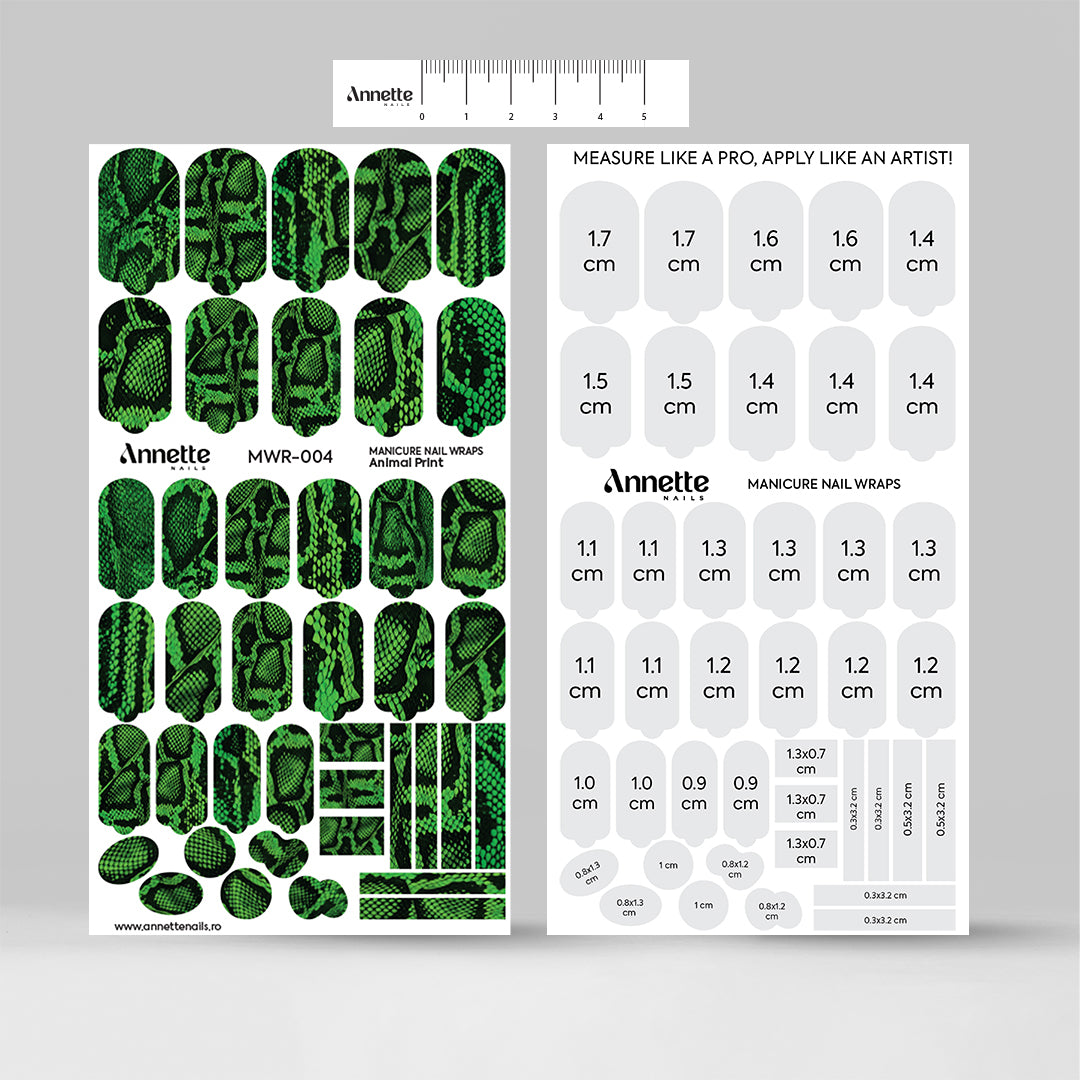 MWR-004 din colecția Nail Wraps Animal Print Annette Nails ilustrează textura autentică a pielii de șarpe, reinterpretată într-o combinație intensă de verde și negru. Fiecare wrap are un design individual, care se combină armonios cu celelalte, conturând un look fluid și echilibrat. În plus, pachetul conține decorațiuni care îți oferă libertatea de a adăuga accente originale și de a personaliza fiecare manichiură. Contrastul cromatic între verde și negru oferă un efect dramatic și elegant, accentuând fiecare detaliu al designului, pentru un efect vizual memorabil.