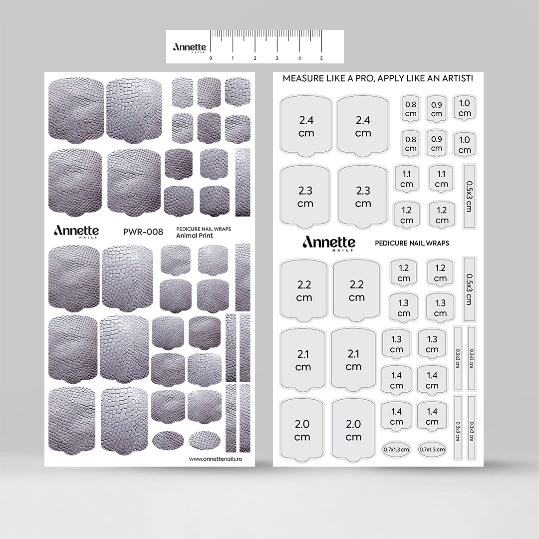 Pedicure Nail Wraps Annette Nails sunt stickere autoadezive pentru unghii, special concepute pentru crearea designurilor sofisticate pe unghii, indiferent de tehnica folosită: pedichiură clasică sau pedichiură semipermanentă. Wrapurile sunt una dintre cele mai populare tehnici pentru decorarea unghiilor și reprezintă o alternativă rapidă și eficientă la pedichiura cu oja semipermanentă. Acestea pot fi utilizate inclusiv pentru uz personal, oferind fiecărei femei posibilitatea de a-și realiza singură o pedichiură cu design deosebit și rezistență extinsă.