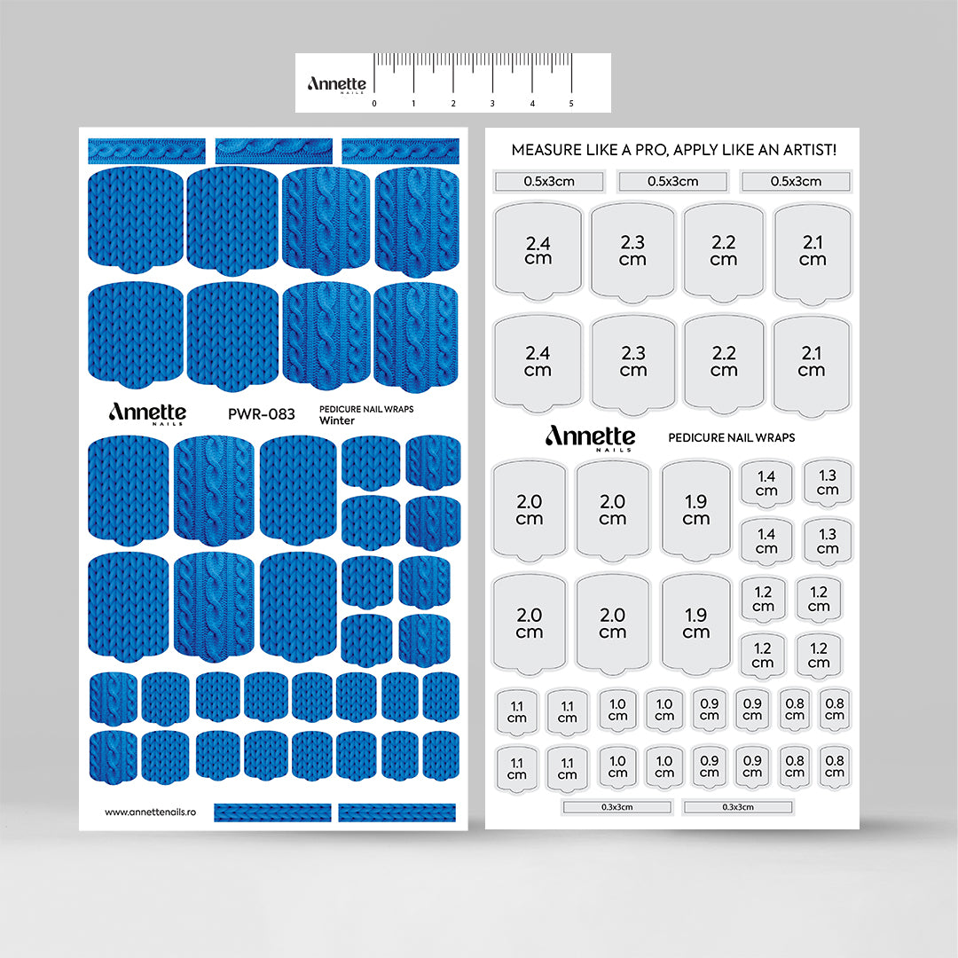 Nail Wraps Winter de la Annette Nails sunt stickere pentru unghii cu designuri de iarnă, ideale pentru pedichiuri festive și rapide: fulgi de nea, brăduți, dulciuri de sezon, împletituri și multe alte elemente adorabile. Colecția de wrapuri pentru iarnă include modele cu detalii extrem de fine, aproape imposibil de redat manual prin pictură, mai ales într-un timp atât de scurt. Iar datorită combinației dintre wrapurile pentru toată unghia și decorațiunile tematice incluse, se pot obține cu ușurință pedichiuri de iarnă spectaculoase, personalizate și cu farmec de sărbătoare.