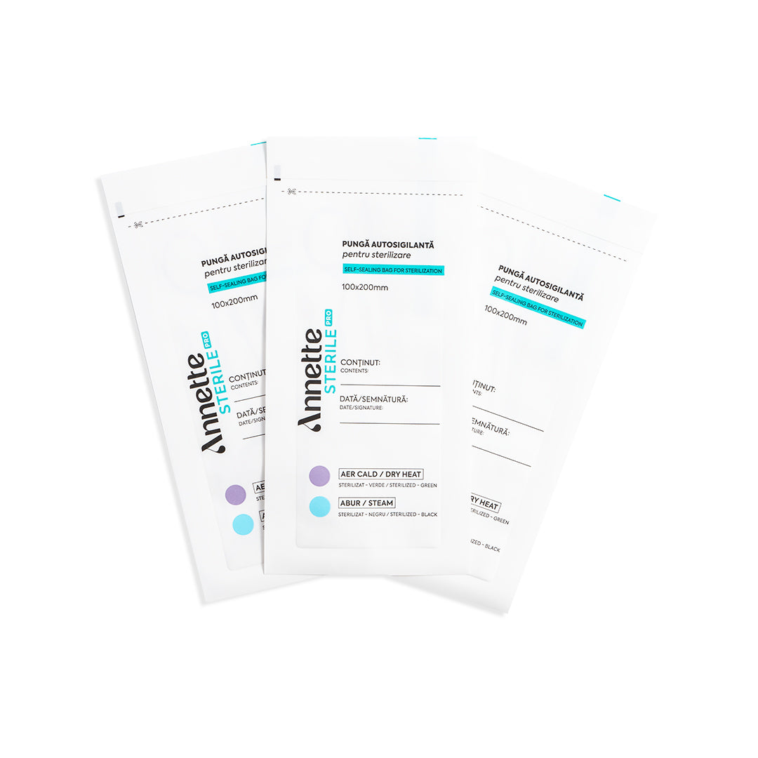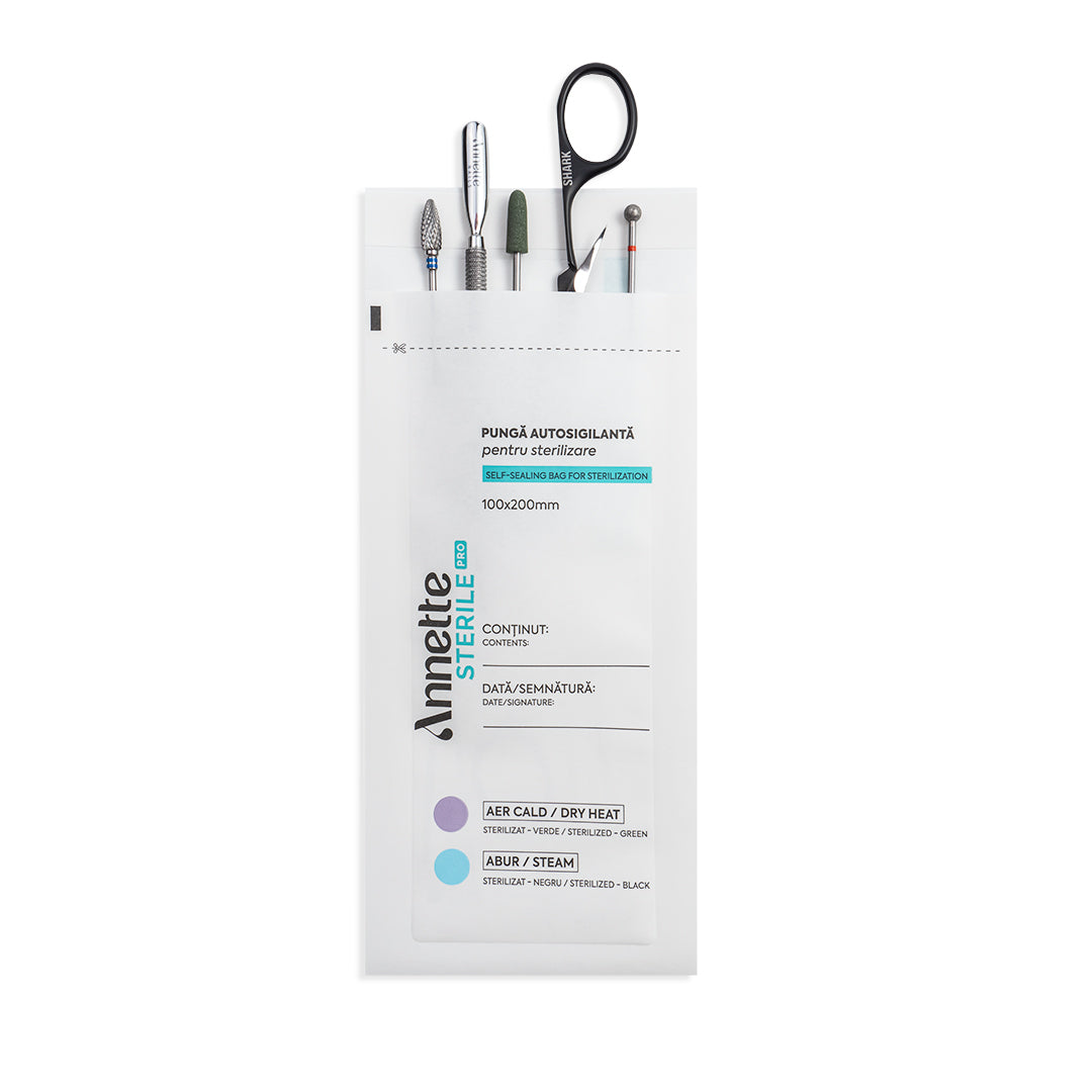 Pungile pentru sterilizare Annette Sterile Pro sunt esențiale tehnicienilor din domeniul manichiurii și pedichiurii, pentru asigurarea standardelor de igienă în salon. Sunt special concepute pentru a garanta protecția clienților împotriva riscului de contaminare cu agenți patogeni periculoși. Pungile sunt utilizate la sterilizarea instrumentelor metalice de manichiură și pedichiură, dar și la ambalarea în siguranță a instrumentelor nemetalice după procesul de dezinfectare din saloane, laboratoare, etc.
