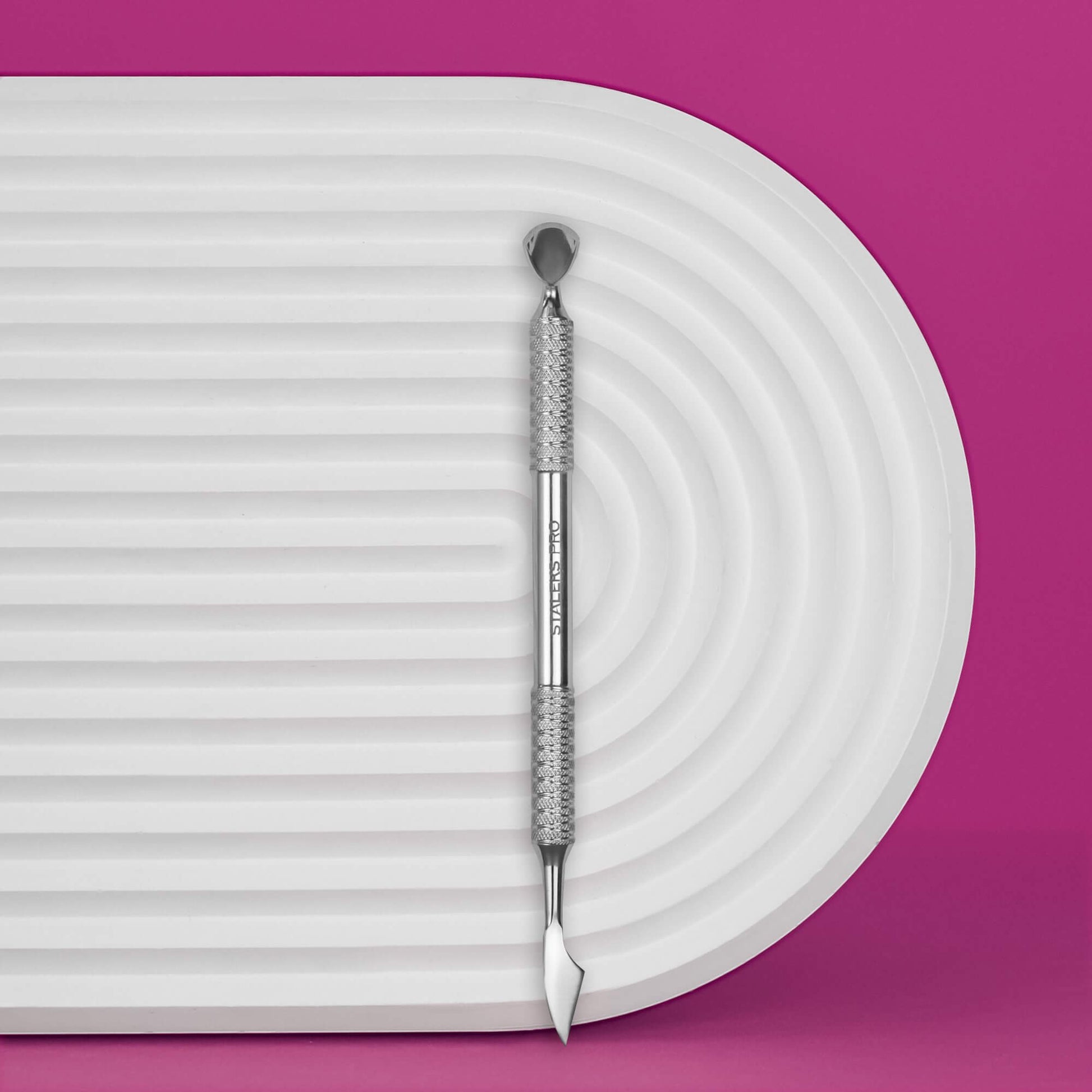 Pusherul este utilizat pentru a împinge cuticula și pentru a îndepărta resturile de cuticulă în timpul procedurii de pedichiură.Acesta are suprafață nichelată, mâner reiat, ce dispune de o formă ergonomică care facilitează uzul intens.