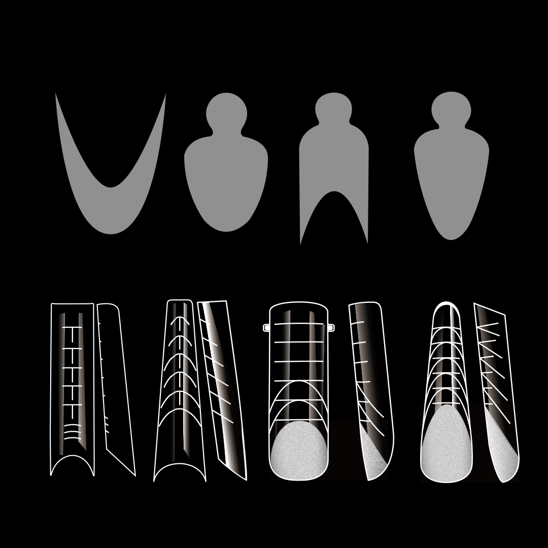 - Setul conține 4 modele de tipsuri pentru construcția în întregime a unghiei sau pentru construcția extensiei, potrivite pentru arhitecturi ale unghiei cu apex sau slim;