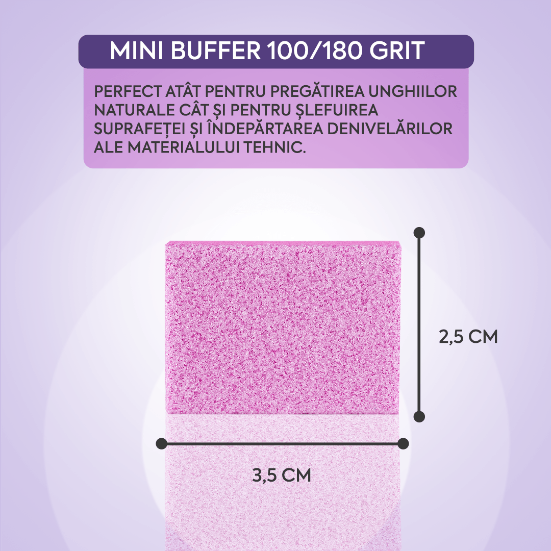 Mini Bufferul vă oferă și el versatilitate, datorită celor două suprafețe cu granulații diferite. Cu abrazivitatea de 180, puteți șlefui uniform și delicat placa unghială, iar cu cea de 100, puteți îndepărta denivelările și uniformiza materialul tehnic.