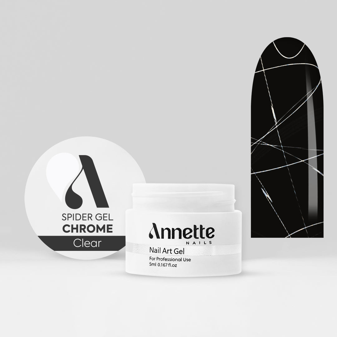 Spider Gel Chrome Annette Nails este un gel transparent, cu textură elastică și vâscozitate ridicată, conceput special pentru utilizarea în asociere cu pudră sau pigmenți chrome. Datorită formulei sale, gelul se întinde în fire subțiri și precise, creând un design ce va servi drept suport pentru fixarea pigmentului.