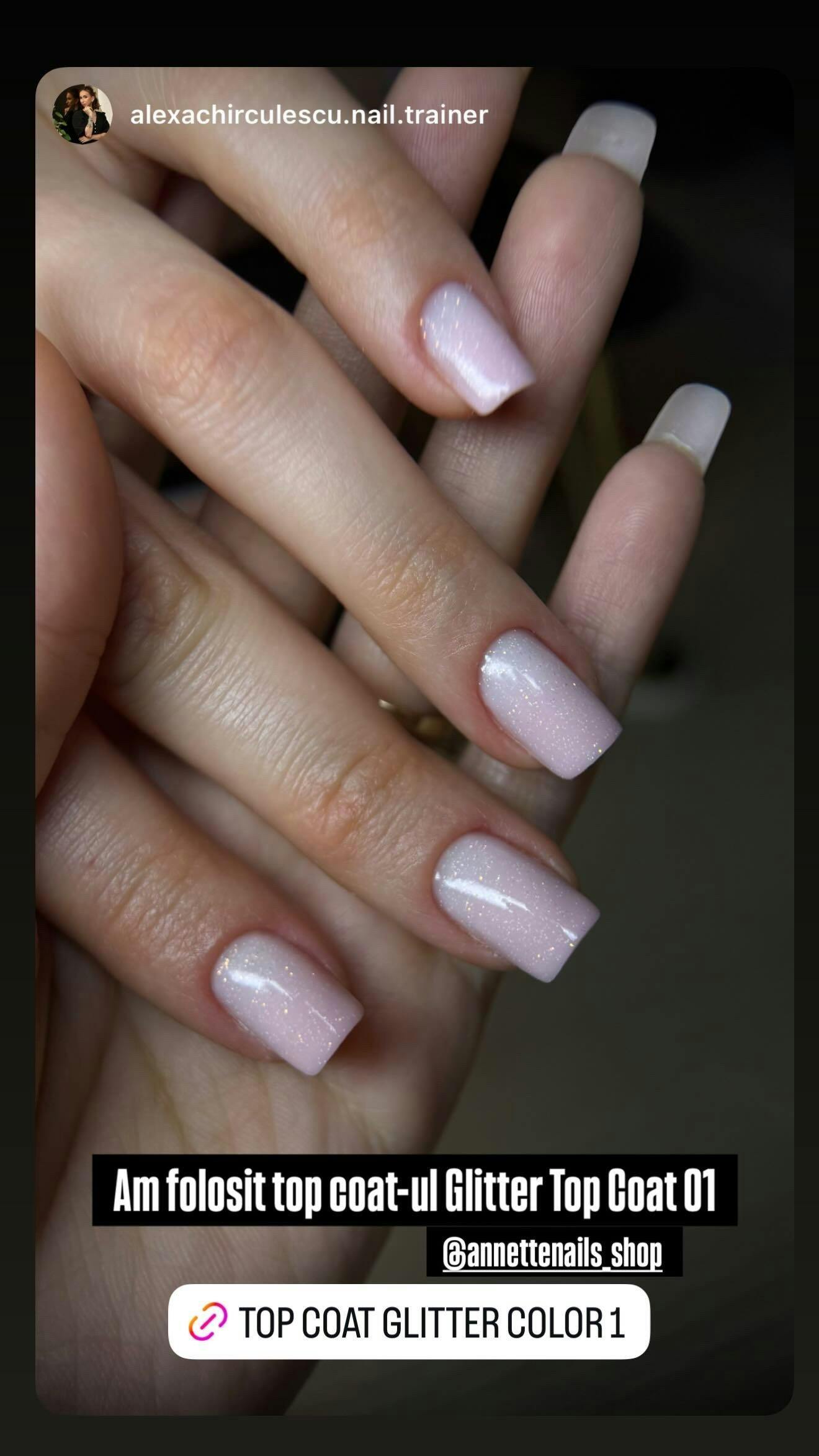 Colecția Top Coat Glitter Color Annette Nails adună top coat-uri color fără strat de dispersie, cu aspect translucid, îmbogățite cu particule fine de sclipici argintiu. Top coat-ul poate fi aplicat peste o culoare fără efect, complementară sau similară acestuia sau direct peste gelul de construcție, polygel, bază rubber, fapt ce îl face ideal în pedichiură, deoarece se reduce efectul de volum al unghiei. Consistența top coat-urilor este una medie spre lichidă, ceea ce le face comode în aplicare.