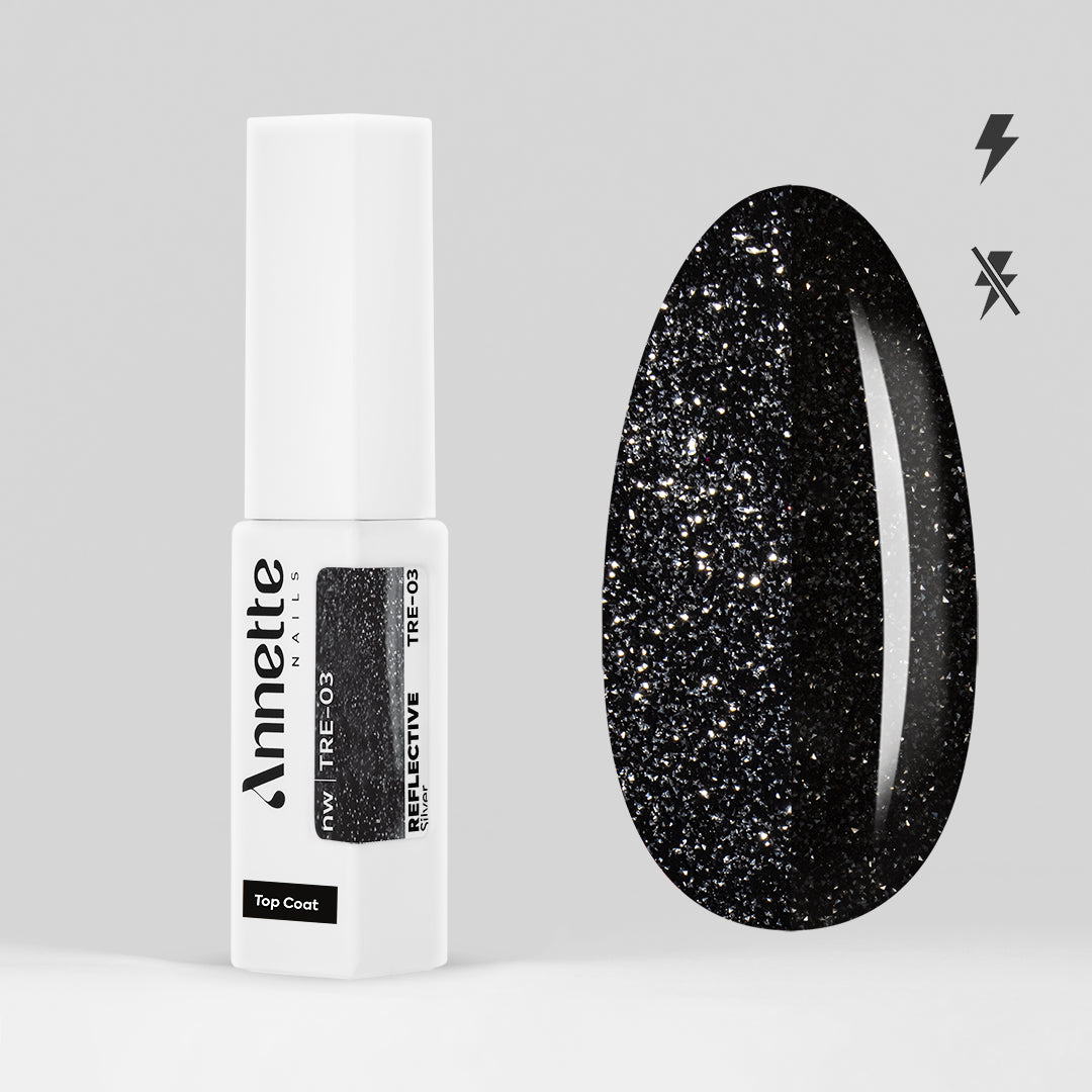 Reflective silver no wipe - este un top coat decorativ, fără strat de dispersie, ce conține particule de sclipici argintiu reflectorizant. Acestea oferă manichiurii o strălucire spectaculoasă când este expusă la o sursă puternică de lumină. Se poate aplica, atât peste nuanțele închise, cât și pe cele deschise sau peste french. Are o consistență medie și se autonivelează rapid în procesul aplicării. Își păstrează luciul pe toată durata purtării manichiurii.